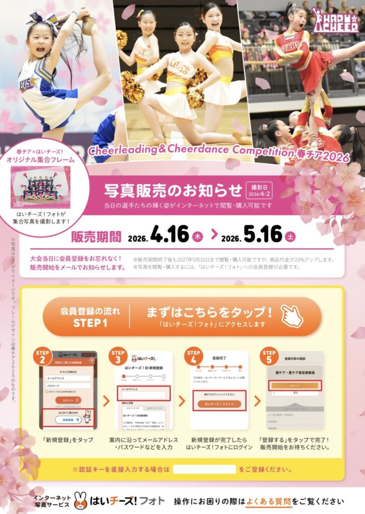 ※詳しくは、春チア2026当日に参加者皆様にお配りする『はいチーズ!フォト写真販売のお知らせ』をご覧ください。